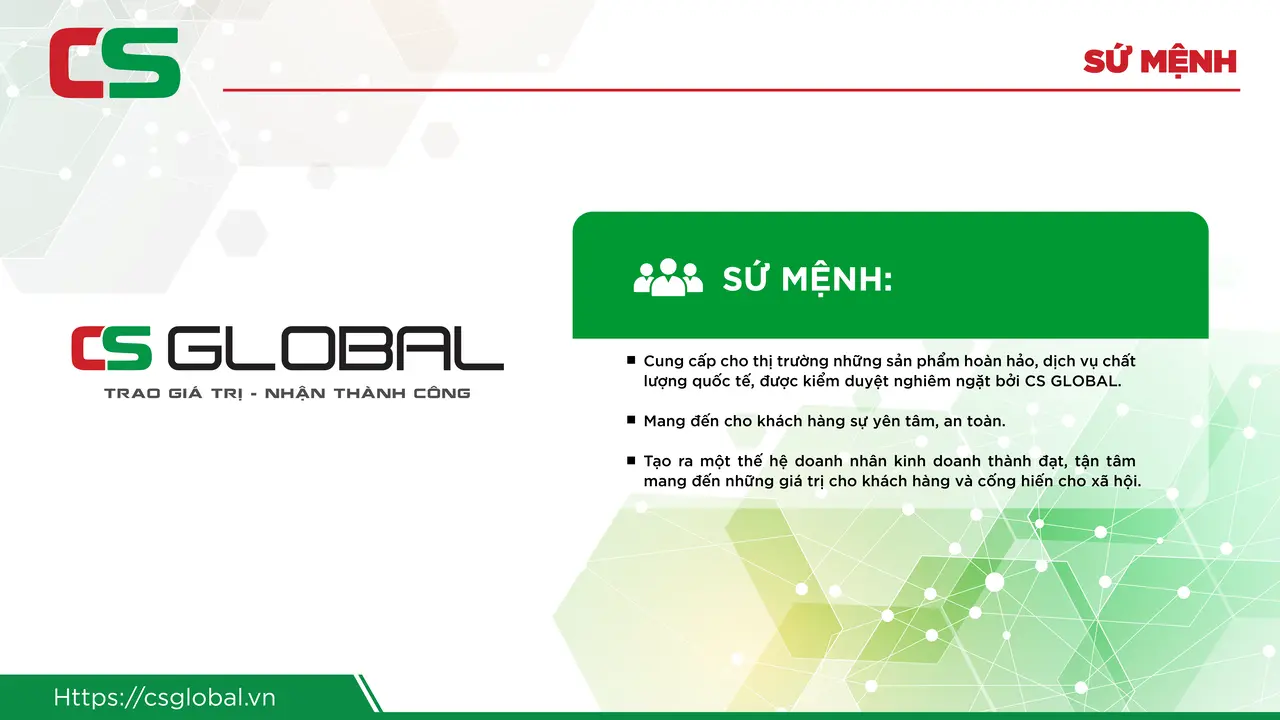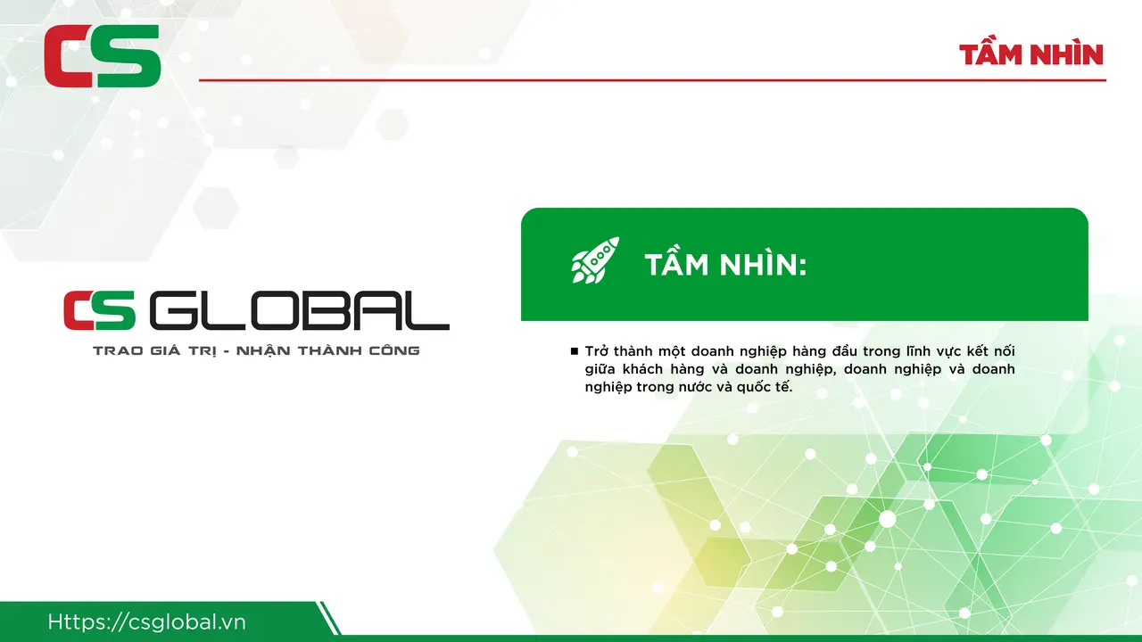 CS GLOBAL được thành lập với sứ mệnh trở thành một doanh nghiệp hàng đầu trong lĩnh vực kết nối giữa khách hàng và doanh nghiệp, doanh nghiệp và doanh nghiệp trong nước và quốc tế.